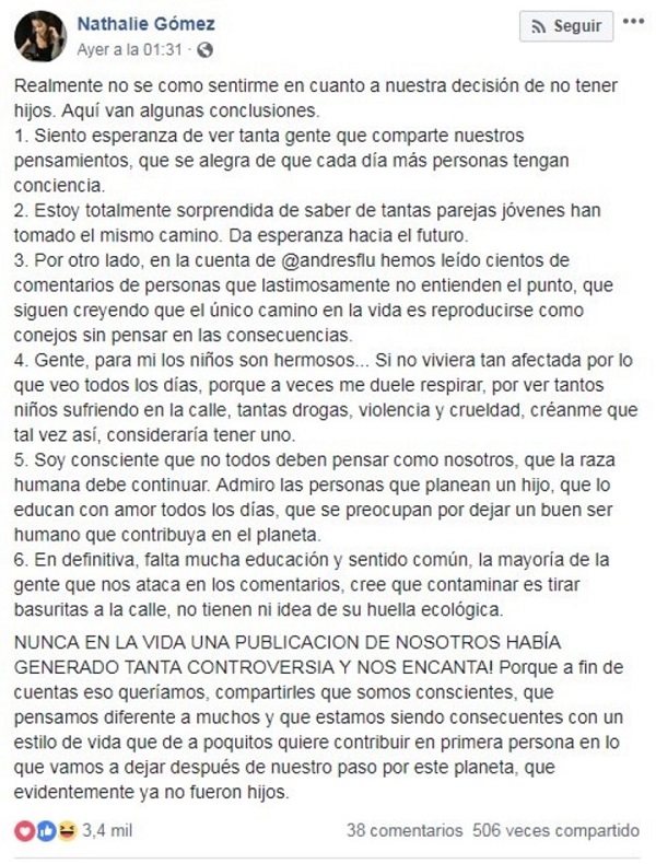 Finalmente concluyó: “Nunca en la vida una publicación nuestra había generado tanta controversia y nos encanta. Porque a fin de cuentas eso queríamos, compartirles que somos conscientes, que pensamos diferente a muchos y que estamos siendo consecuentes con un estilo de vida que de a poquitos quiere contribuir en primera persona en lo que vamos a dejar después de nuestro paso por este planeta, que evidentemente ya no fueron hijos”, puntualizó.