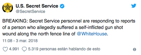 “El personal del Servicio Secreto está atendiendo a los informes sobre una persona que presuntamente se disparó un tiro frente a la parte norte de la valla (que protege el edificio)”, informó a través de Twitter esa entidad, que unos minutos más tarde añadió que personal médico se había desplazado hasta el lugar del incidente.
