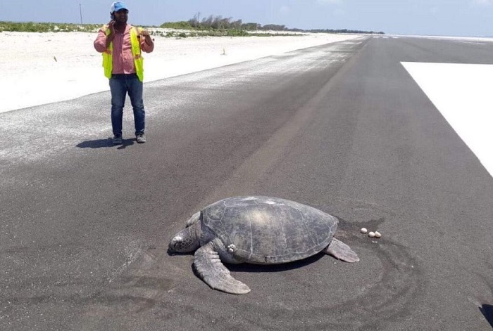 El martes pasado, habitantes de Mandhoo, una de las islas Maldivas, encontraron a una tortuga verde intentando poner sus huevos en medio de la pista del aeropuerto Maafaru.