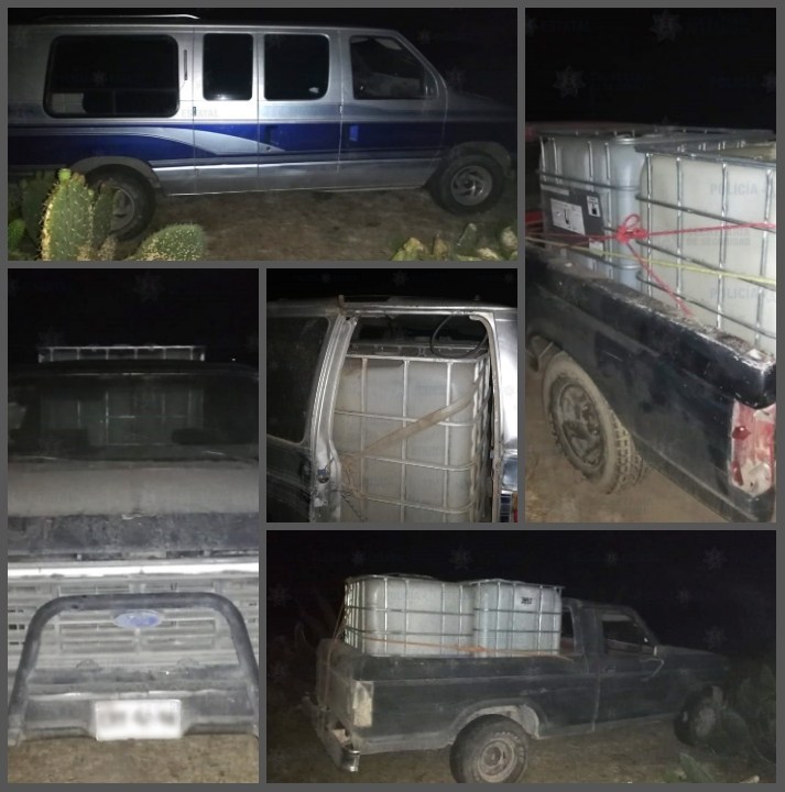 Al concluir la inspección, al interior de las camionetas se detectaron siete contenedores con arnés metálico vacíos, todos con capacidad de mil litros, en los que se presume se podría transportar el hidrocarburo sustraído ilegalmente.