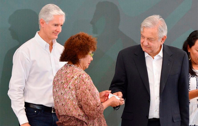 López Obrador hizo entrega de tarjetas de pensión de los Programas de Bienestar que ofrece a adultos mayores, personas con discapacidad y jóvenes estudiantes.