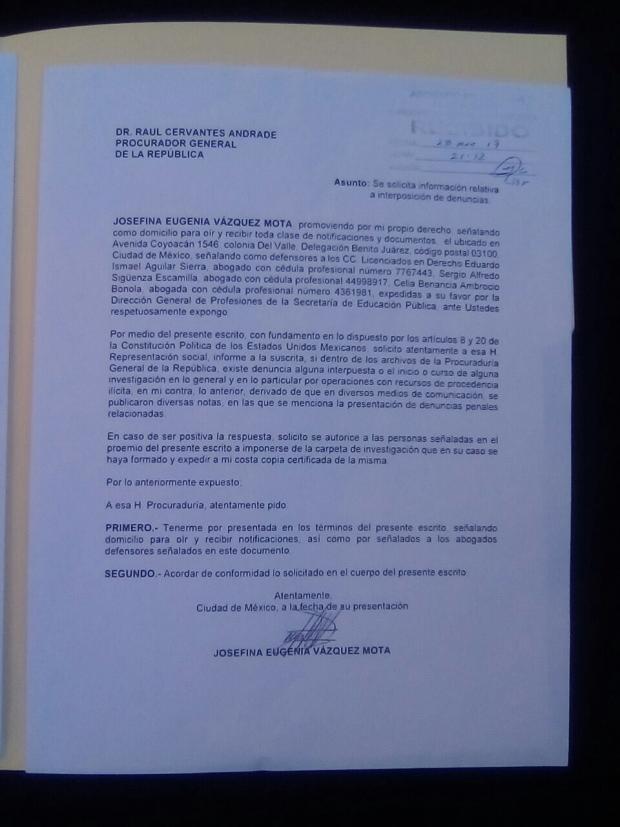 Josefina Vázquez Mota solicitó a la Procuraduría General de la República información sobre el inicio de alguna averiguación previa “en lo general y en lo particular” por el delito de operaciones con recursos de procedencia ilícita.