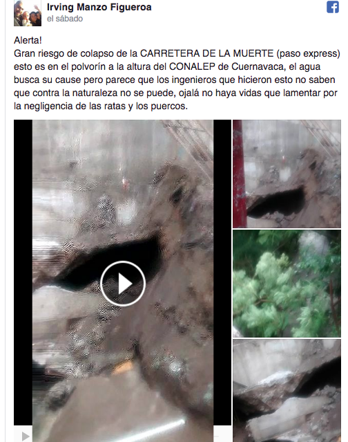 A través de su cuenta de Facebook, el usuario Irving Manzo Figueroa denunció el pasado 8 de julio que las fallas del Paso Exprés podrían llegar a cobrar las vidas de personas.