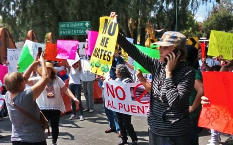 Colonos de varios fraccionamientos tomaron este lunes las obras de construcción del puente vehicular San Mateo Tecoloapan y suspendieron por horas los trabajos, para impedir que se continuara con esta vialidad que, a decir de ellos, no la necesitan.