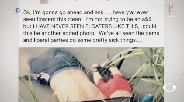 Según reporta el noticiero En Punto, de Televisa, en este grupo, con más de 9 mil 500 miembros, se publican imágenes como la de Oscar Martínez y su hija Valeria, quienes murieron ahogados en el río Bravo. La foto está acompañada de un mensaje en el que señalan que podría tratarse de una forma de manipulación por parte de políticos demócratas.