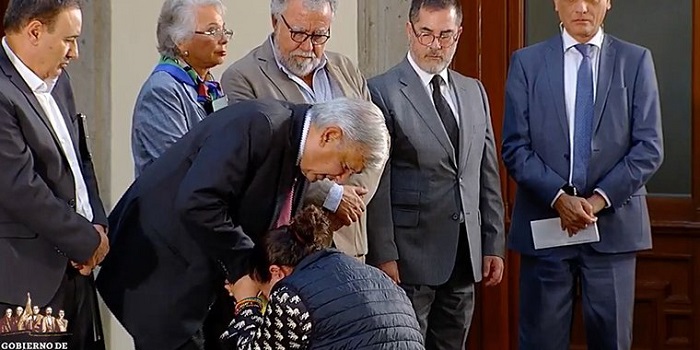 Luego del discurso del subsecretario en derechos humanos Población y Migración de la Secretaría de Gobernación (Segob), Alejandro Encinas, quien destacó que el presupuesto para lograr la primera etapa del Sistema Nacional de Búsqueda y dijo que se invertirán 410 millones de pesos, la mujer pasó al frente y le dirigió unas palabras al presidente pidiéndole su ayuda para encontrar a su hijo y se puso de rodillas.