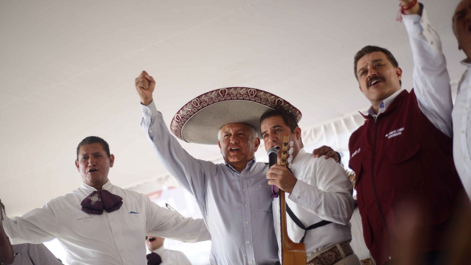 “En serio espero que tu papá no te quiera regresar, si se entera por quien voy a votar. Estoy enamorado pero tienes que saber algo, ahora sí voy a votar por AMLO”, canta un hombre que baila al lado de sujetos con máscaras del rostro del político tabasqueño.