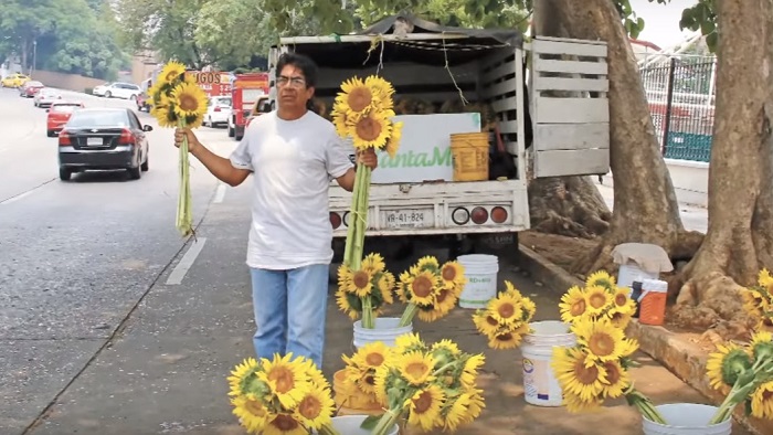 Desde hace 10 días, Don Gelo vende girasoles parado en el circuito de la ciudad deportiva de Villahermosa, y dice que no pierde la esperanza de ser llamado para sumarse al gobierno federal.