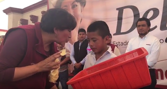 Instantes después de asegurar que sus adversarios le tienen miedo, un niño vendedor de papas, conmovió a Delfina Gómez Álvarez, cuando se acercó por sorpresa y le regaló una bolsa de papas fritas a la candidata de Morena.