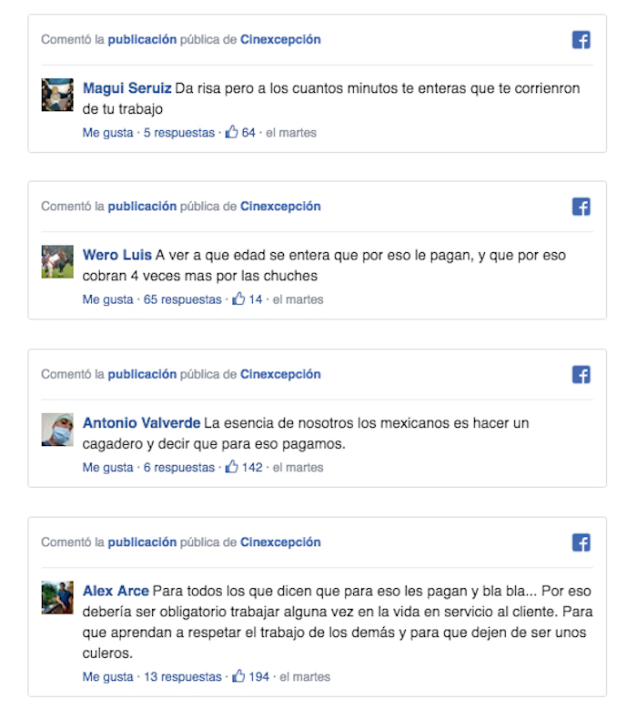 La joven, visiblemente fastidiada y de forma sarcástica, instó a los asistentes a las salas de cine, recoger y llevarse su basura. “¿A los cuántos años se enteraron de que la charola que piden para meter sus cosas al cine, también la pueden usar para sacar ¡su pinche basura de la sala!?”,les “recordó”.