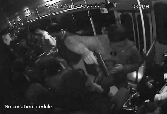 Después del aterrador grito de los asaltantes, se observa como tres sujetos que ya viajaban en la unidad se incorporan de distintos asientos, también ubicados uno al frente, quien se dirige inmediatamente al conductor de la unidad; otro en la parte media del autobús, quien saca un arma de fuego, corta cartucho y se va directo contra los pasajeros para amedrentarlos y exigirles que entreguen sus cosas de valor, y un tercero que se incorpora de la parte de atrás que también agrede y encañona a las víctimas.