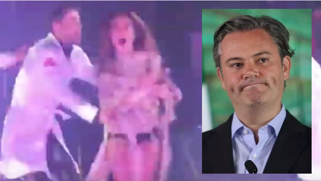 Un video que grabó el conductor Miguel Charles muestra a la polémica cantante tomar líquido de una botella, acercarse a la primera fila donde estaba el ex secretario de Estado aplaudiendo y escupirle.