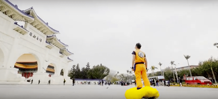 Un gran fanático de la serie Dragon Ball, llevó su amor a otro nivel al sorprender a habitantes de la ciudad de Taipei, China, al aparecer disfrazado como Gokú mientras viajaba en su “nube voladora”.
