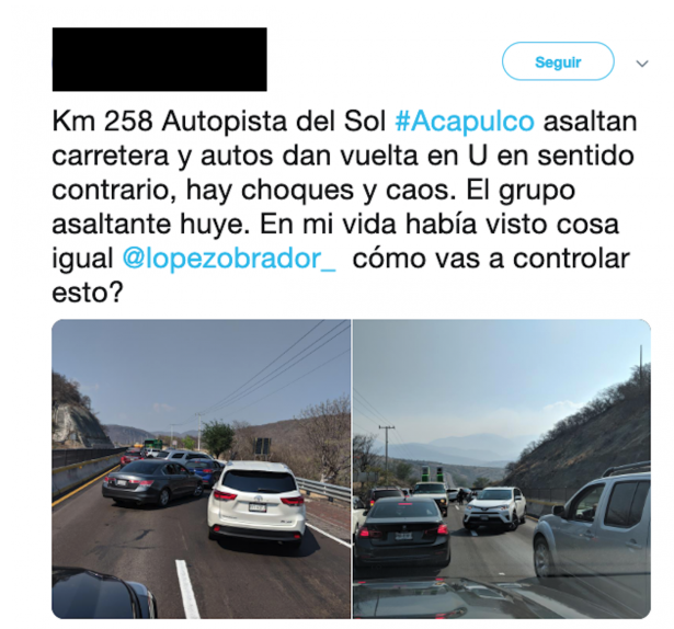 De acuerdo con testimonios, en la salida norte de Chilpancingo un grupo de sujetos armados asaltaba a automovilistas aprovechando la lenta circulación del tramo entre Acapulco y Ciudad de México, provocada por el flujo de vehículos pero también por obras de encarpetado a la altura del kilómetro 112.