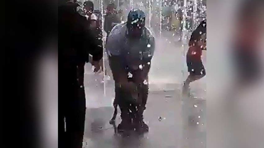 En las imágenes se aprecia que el can y un grupo de niños se encuentran jugando con el agua que arrojan las fuentes colocadas en el lugar.