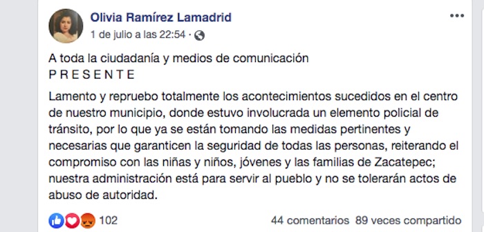 La Presidenta municipal de Zacatepec, Olivia Ramírez Lamadrid, lamentó los hechos en su cuenta de Facebook y dijo que “no se tolerarán actos de abuso de autoridad”.