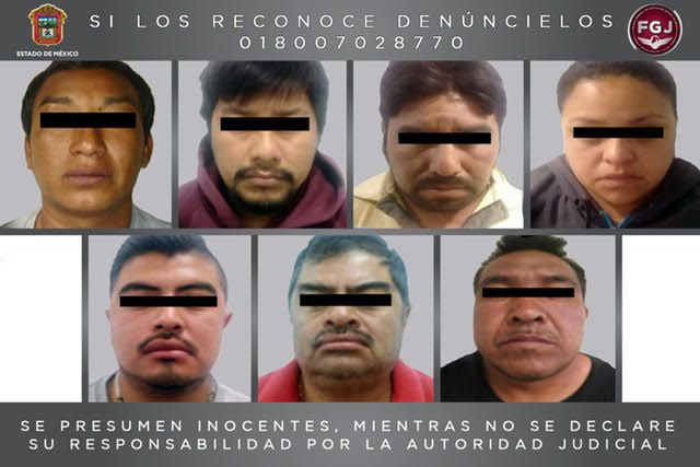 Los detenidos fueron identificados como Claudia Ivette “N”, Adrián “N”, Benito “N”, Jorge “N”, Héctor “N”, Arturo “N”, Oscar “N”, y Juan Carlos “N”, quienes enfrentan cargos por ilícitos registrados en los municipios de Chalco, Ayapango y La Paz.
