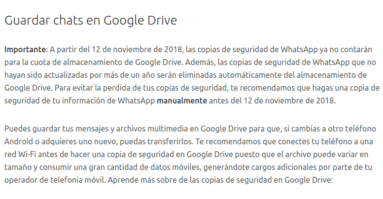 Advierte la app de mensajería que “las copias de seguridad de WhatsApp que no hayan sido actualizadas por más de un año serán eliminadas automáticamente del almacenamiento de Google Drive”