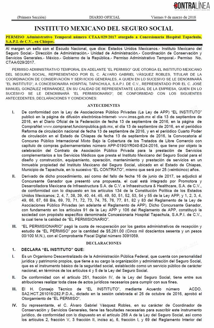 El contrato, por 25 años, tiene por objeto “la prestación de servicios complementarios a los servicios médicos que presta el Instituto para el diseño, construcción, equipamiento, operación y mantenimiento de un Hospital Regional de 260 camas, en un inmueble propiedad del Instituto Mexicano del Seguro Social”.