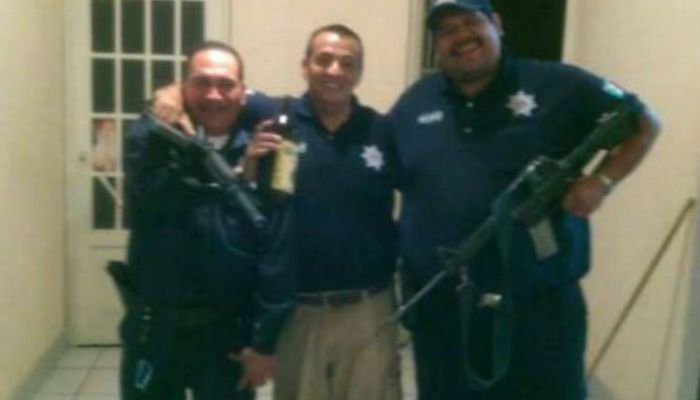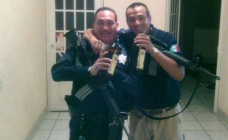Muy bonitos aparecieron tres policías en una imagen difundida en Internet, donde se observa cómo conviven con caguama y arma en mano.