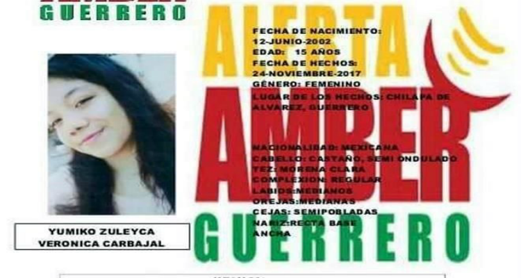 El pasado 24 de noviembre, la adolescente de nombre Yomiko Zuleyca Verónica Carbajal de 15 años de edad desapareció en Chilapa, por lo que autoridades emitieron su Alerta Amber para dar pronto con su paradero.