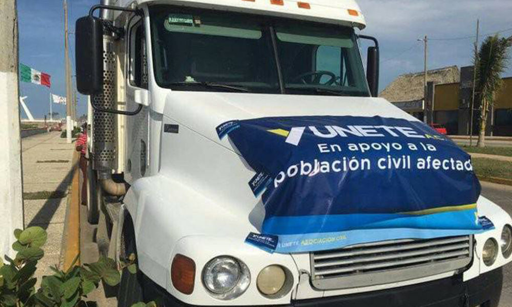 En las fotos se aprecian camiones y camionetas con la leyenda “Yunete A.C.”, y con el slogan “En apoyo a la población civil afectada”. También se observa a una mujer con una playera azul entregando despensas con la misma etiqueta.