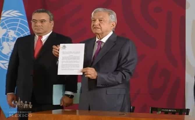 Además, agradeció la presencia de legisladores y funcionarios de organismos internacionales (junta a la bandera de México, a su espalda, estaba también la de la Organización de las Naciones Unidas), y adelantó que este lunes se presentará el programa para el desarrollo de México y los países de Centroamérica, para dar atención estructural, de fondo, eficaz y humana al fenómeno migratorio.